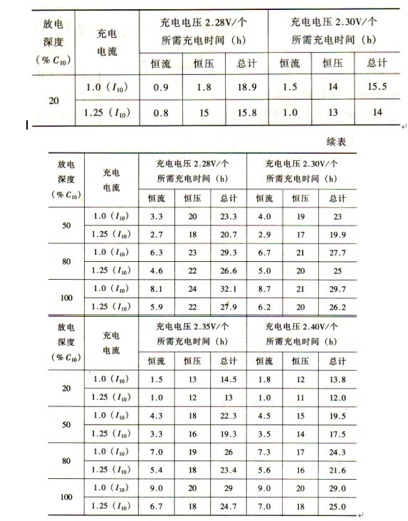初充電一浮充電一均衡充電是按下列程序循環(huán)進行的。在投運前,對電池進行初充電,此時用恒流為l.Oll0進行充電。當單體電池電壓上升到2.35V轉為恒壓充電,此時充電流逐漸減少,然后轉為正常運行狀態(tài)即浮充電壓為2.25V。當運行720h后,進行均衡充電,即先以恒流l.Ollo電池充電,至電池電壓為2.35V轉為恒壓充電,電壓恒定一段時間又轉為正常浮充狀態(tài)。當交流電源中斷后,此時自動 進行均衡充電,以恒流l.Ol】o充電。電池電壓上升至2.35V后和上述運行初充后均衡充電的過程相同。上述兩階段充電,其浮充轉均充的判斷大多采用時間來整定,即不論放電幅度如何,一日由恒流階段轉入恒壓階段后,延時若干個小時,則自動轉為浮充。實際情況是充電所需時間與放電幅度有關,如圖3-1所示。因此事故放電的深度是隨機的,若用一個固定的時間來操作,則有可能造成電池的過充或欠充,所以采用蓄電池回路的充電電流作為均充終期的判據(jù)是較合理的。不同放電深度后充電的所需時間見表3-1。表3-1 不同放電深度后充電所需時間